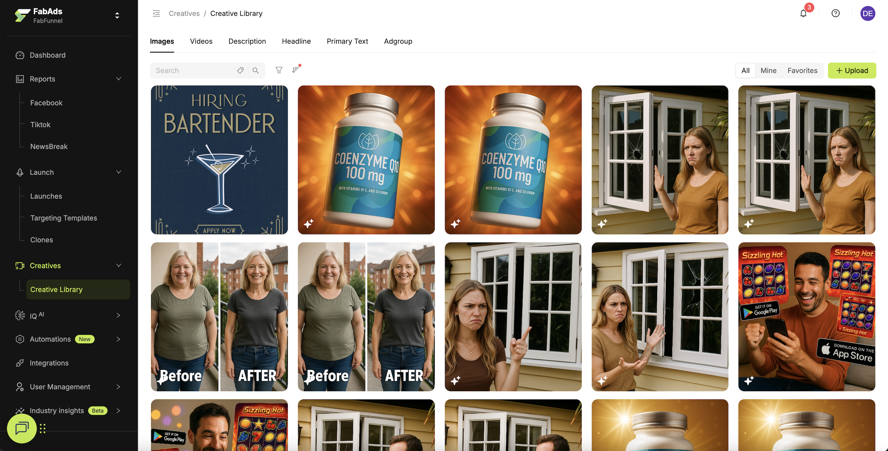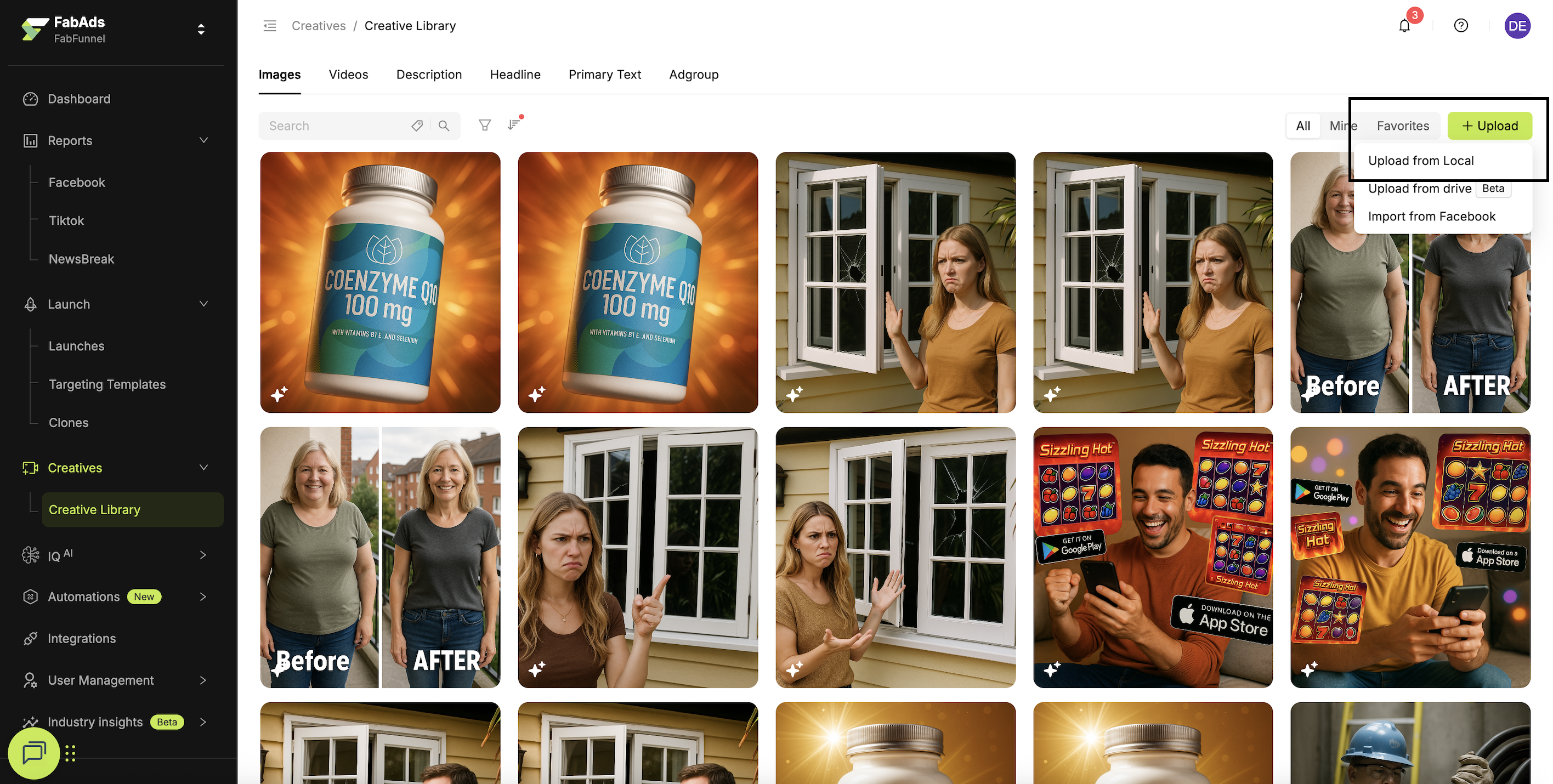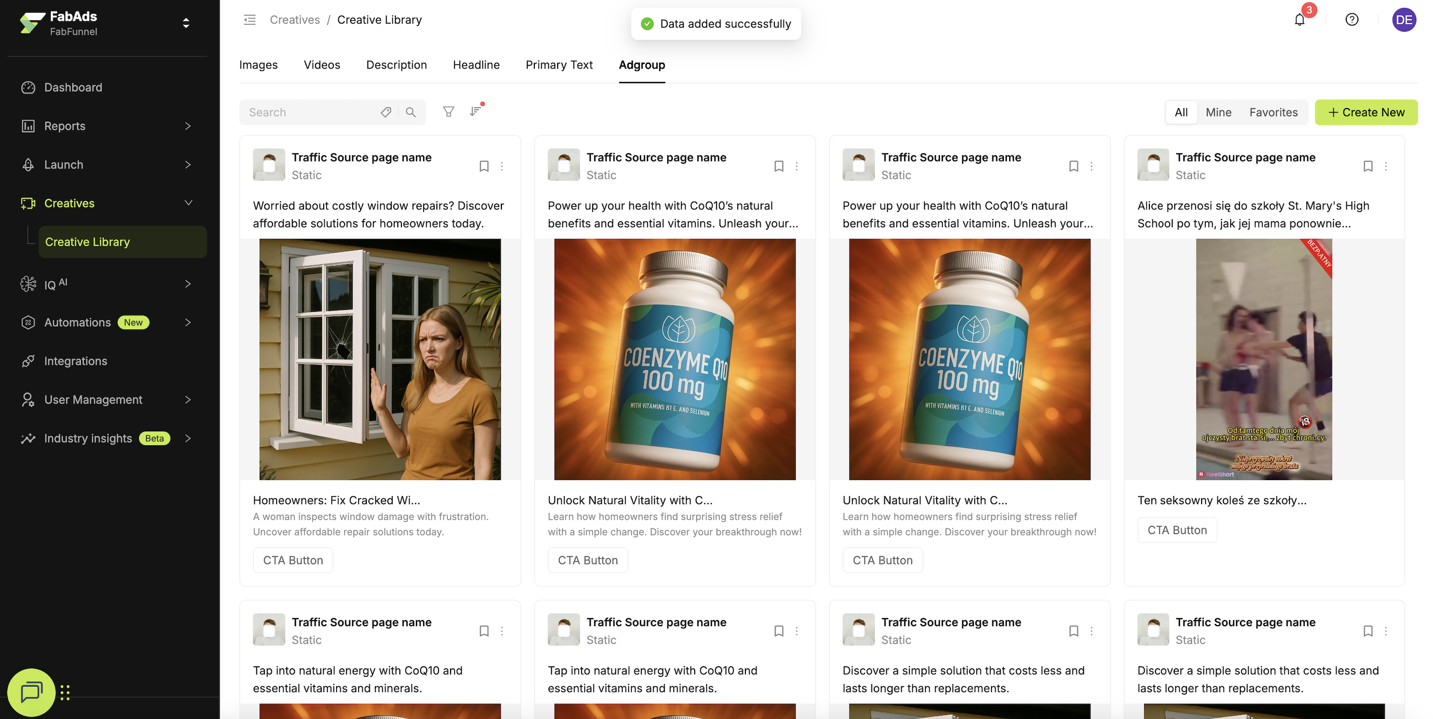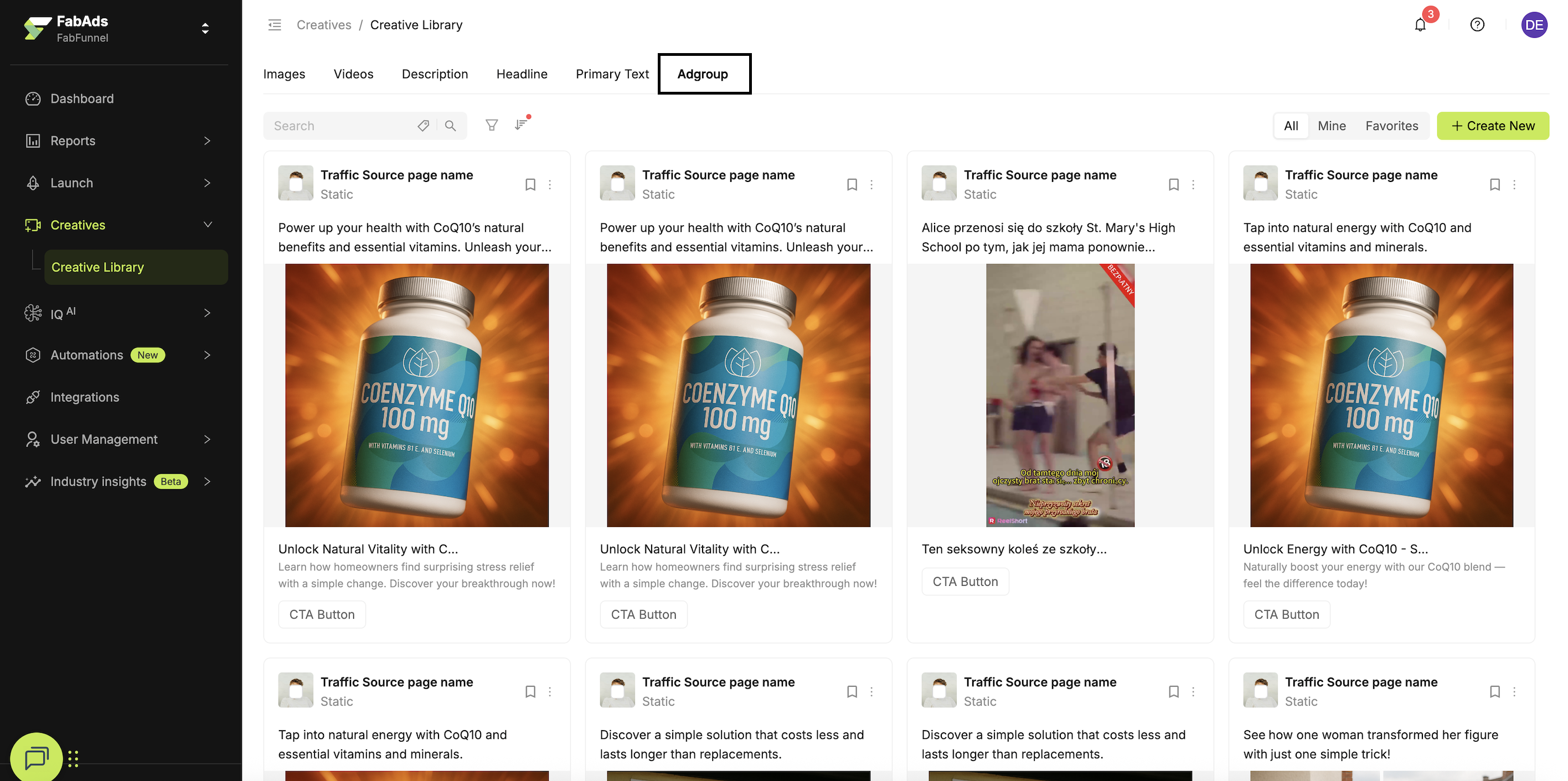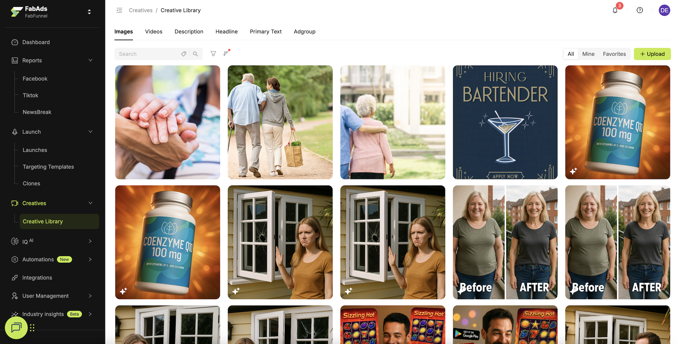 FabFunnel’s Creative Library centralizes management of images, videos, headlines, text, and adgroups. You can upload creatives from multiple sources, tag them for easy organization, and assemble complete adgroups.