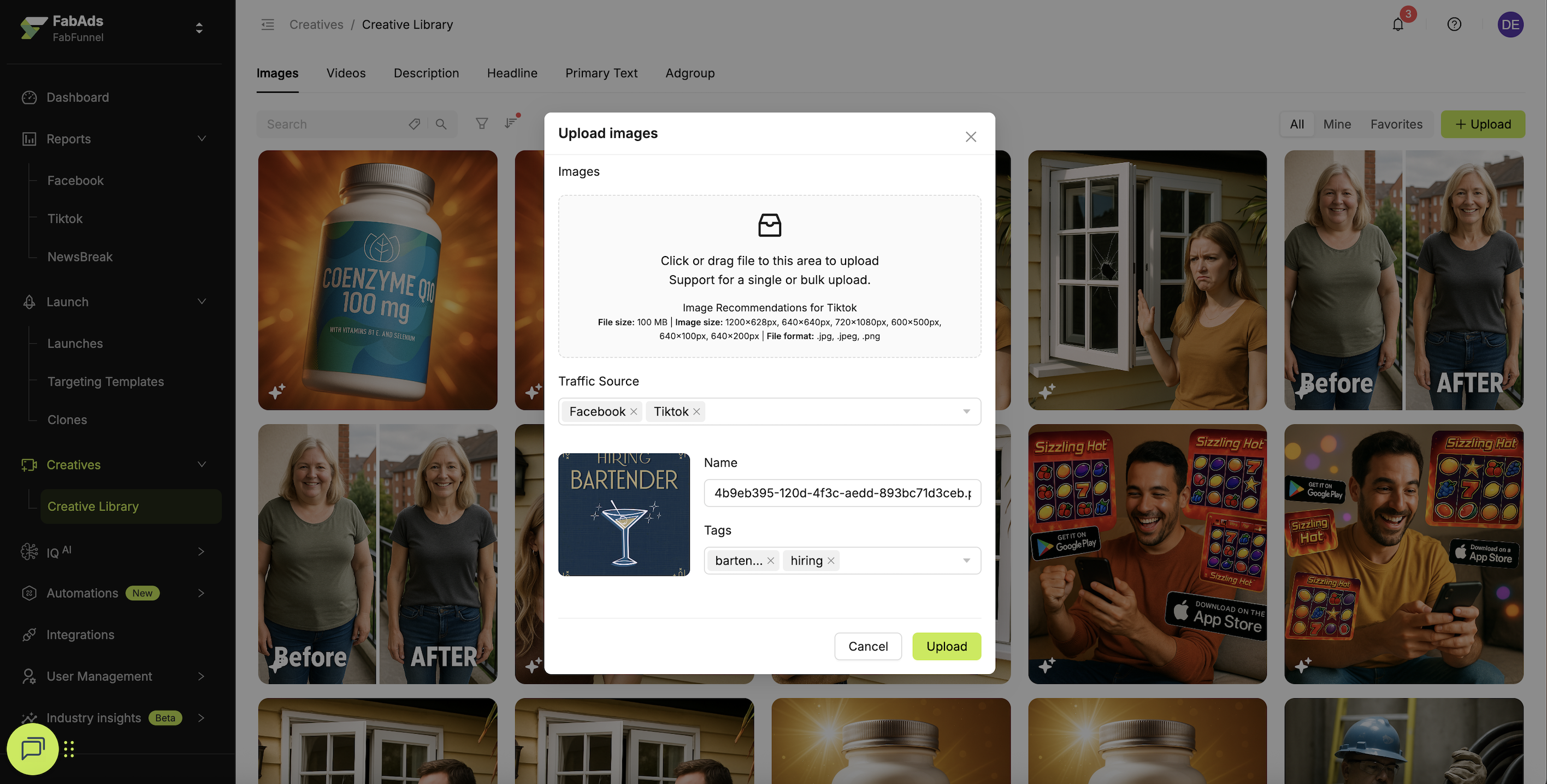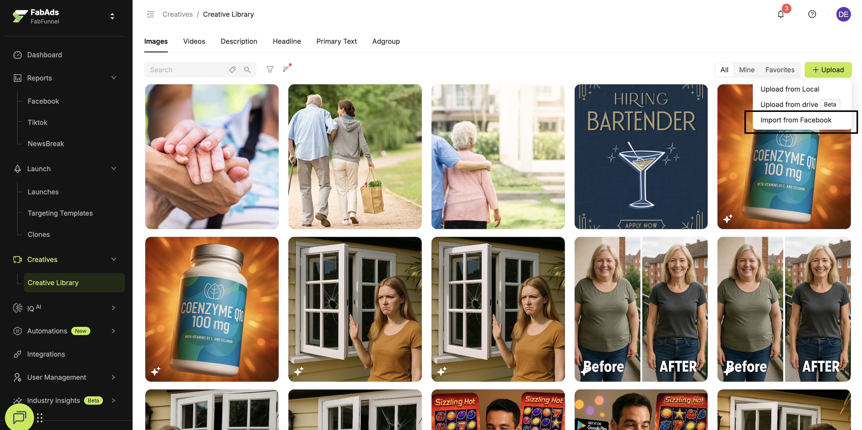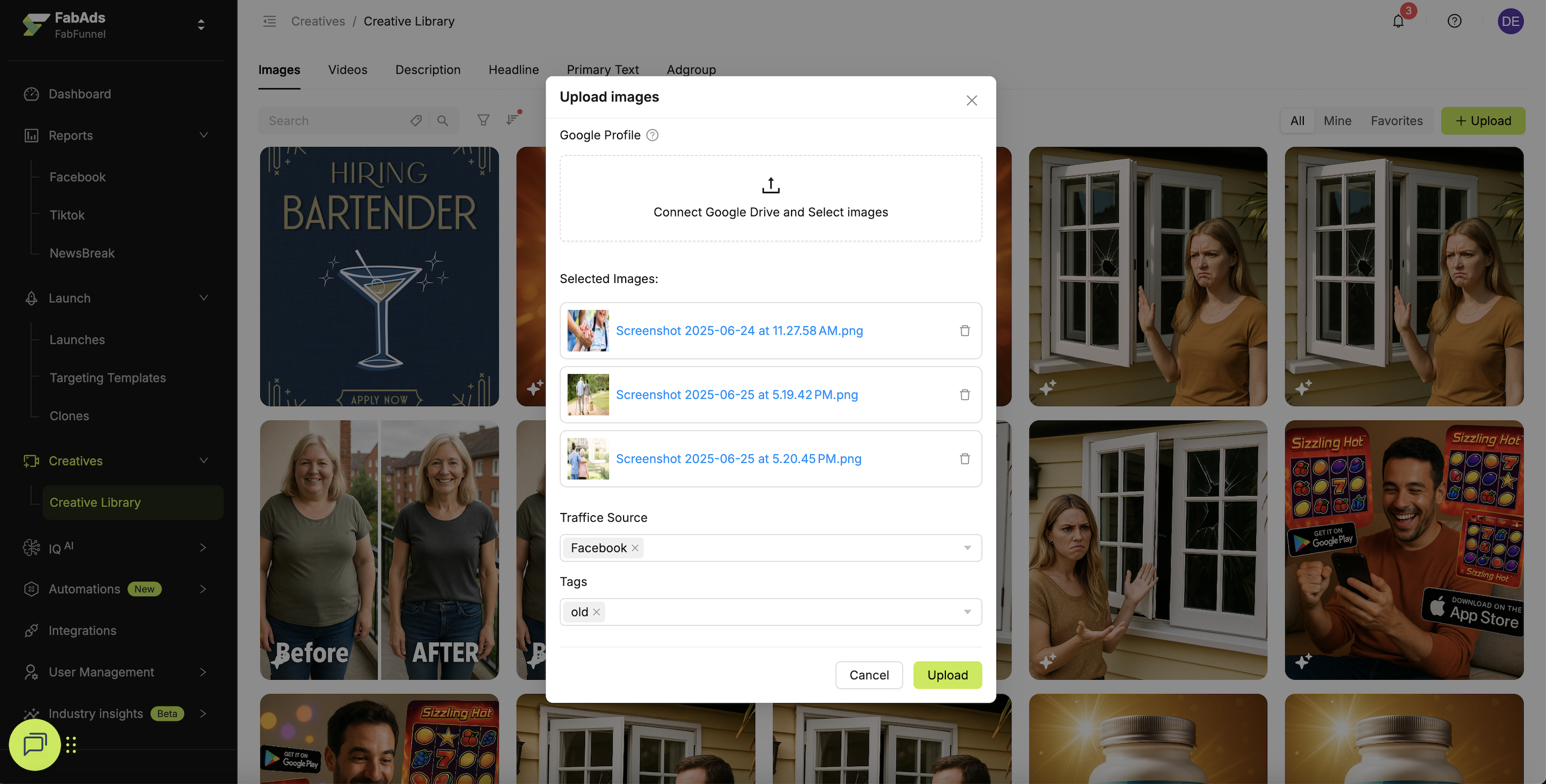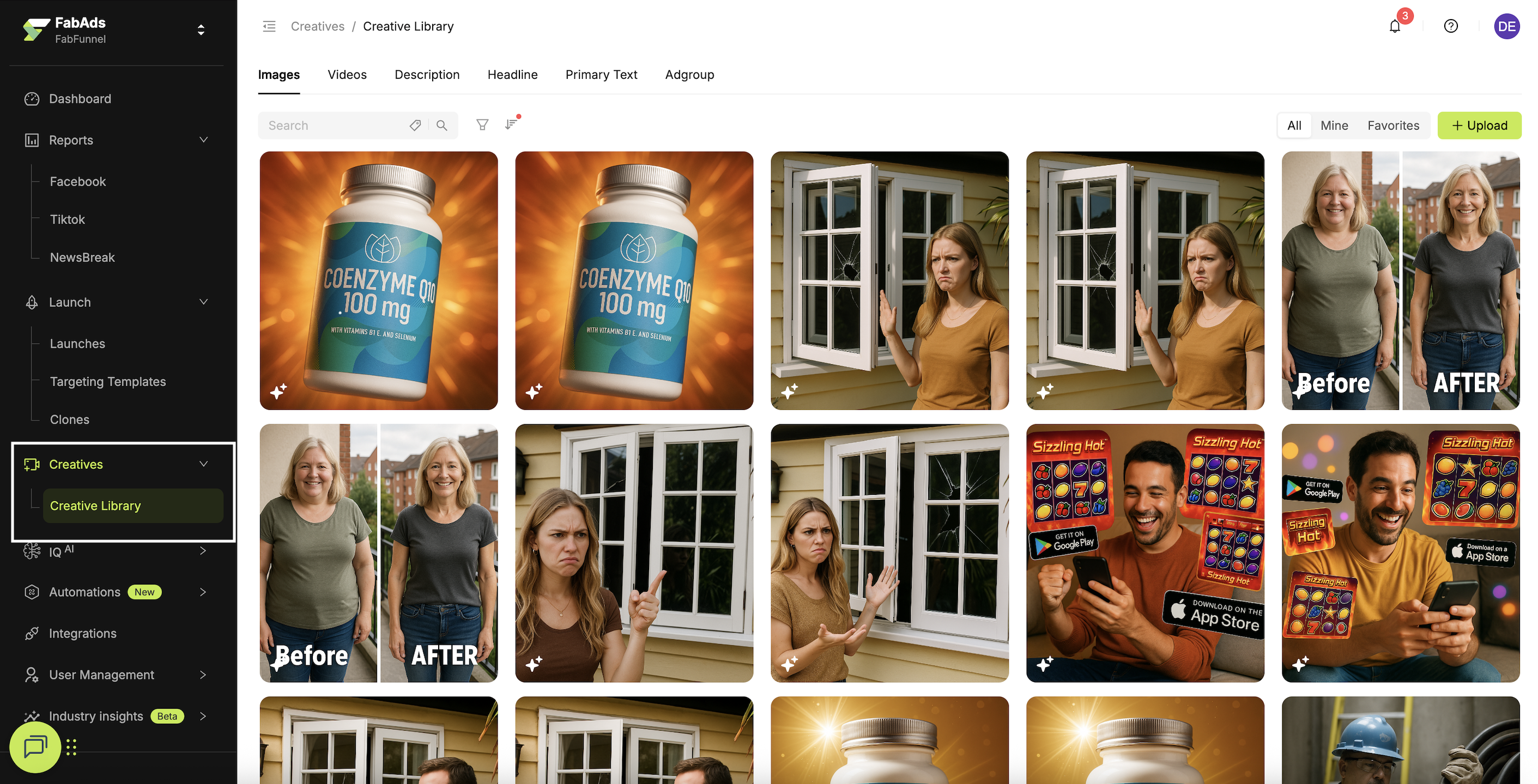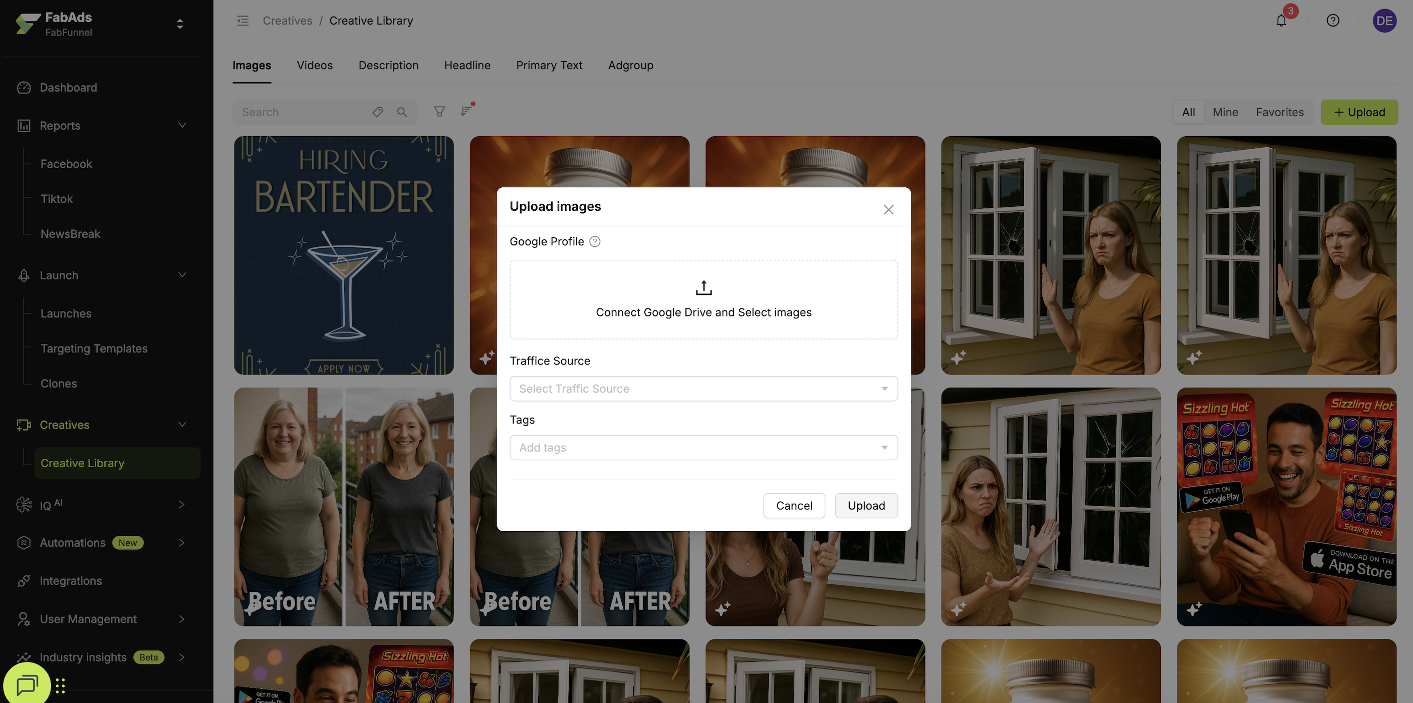 FabFunnel’s Creative Library centralizes management of images, videos, headlines, text, and adgroups. You can upload creatives from multiple sources, tag them for easy organization, and assemble complete adgroups.