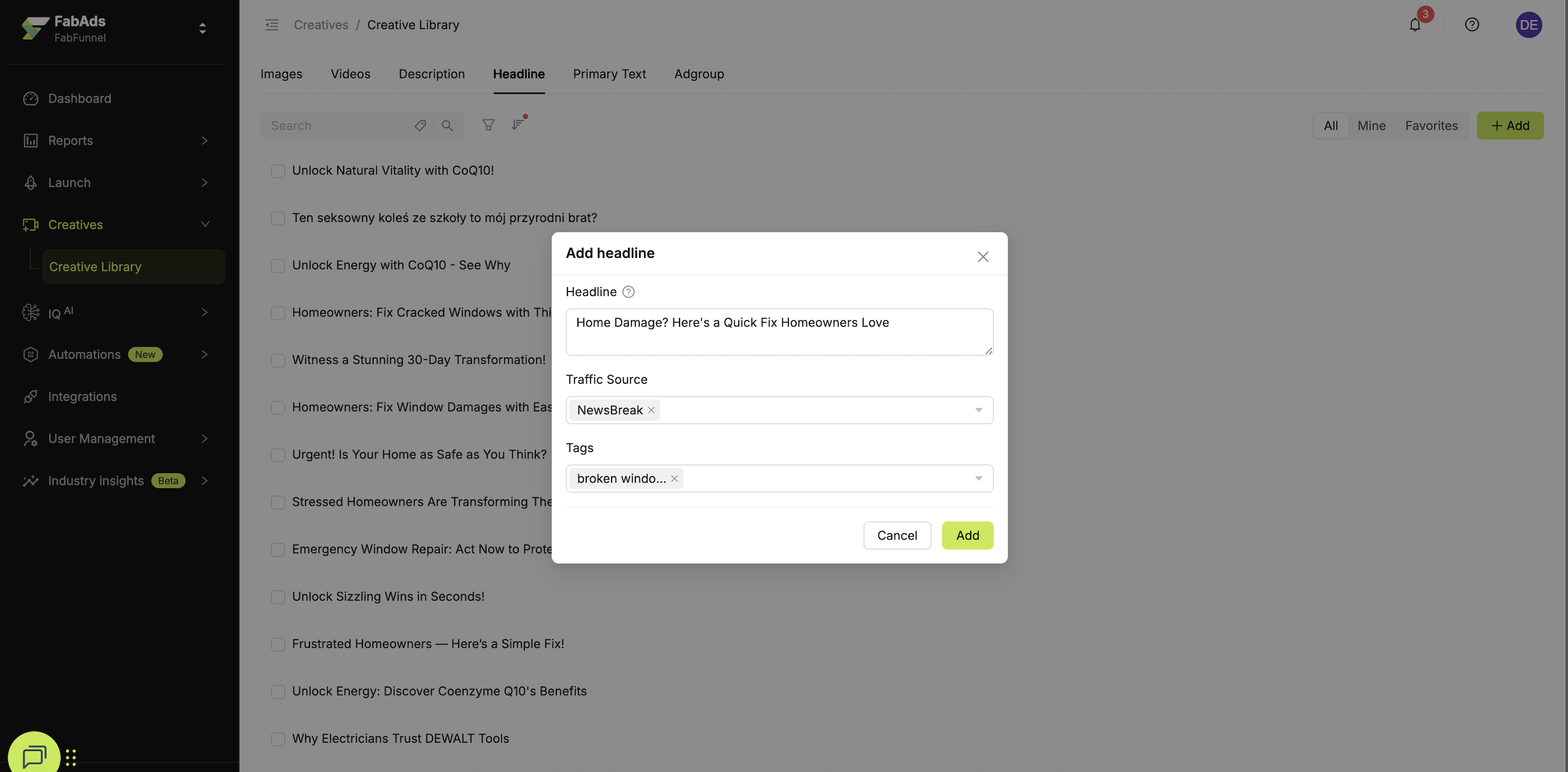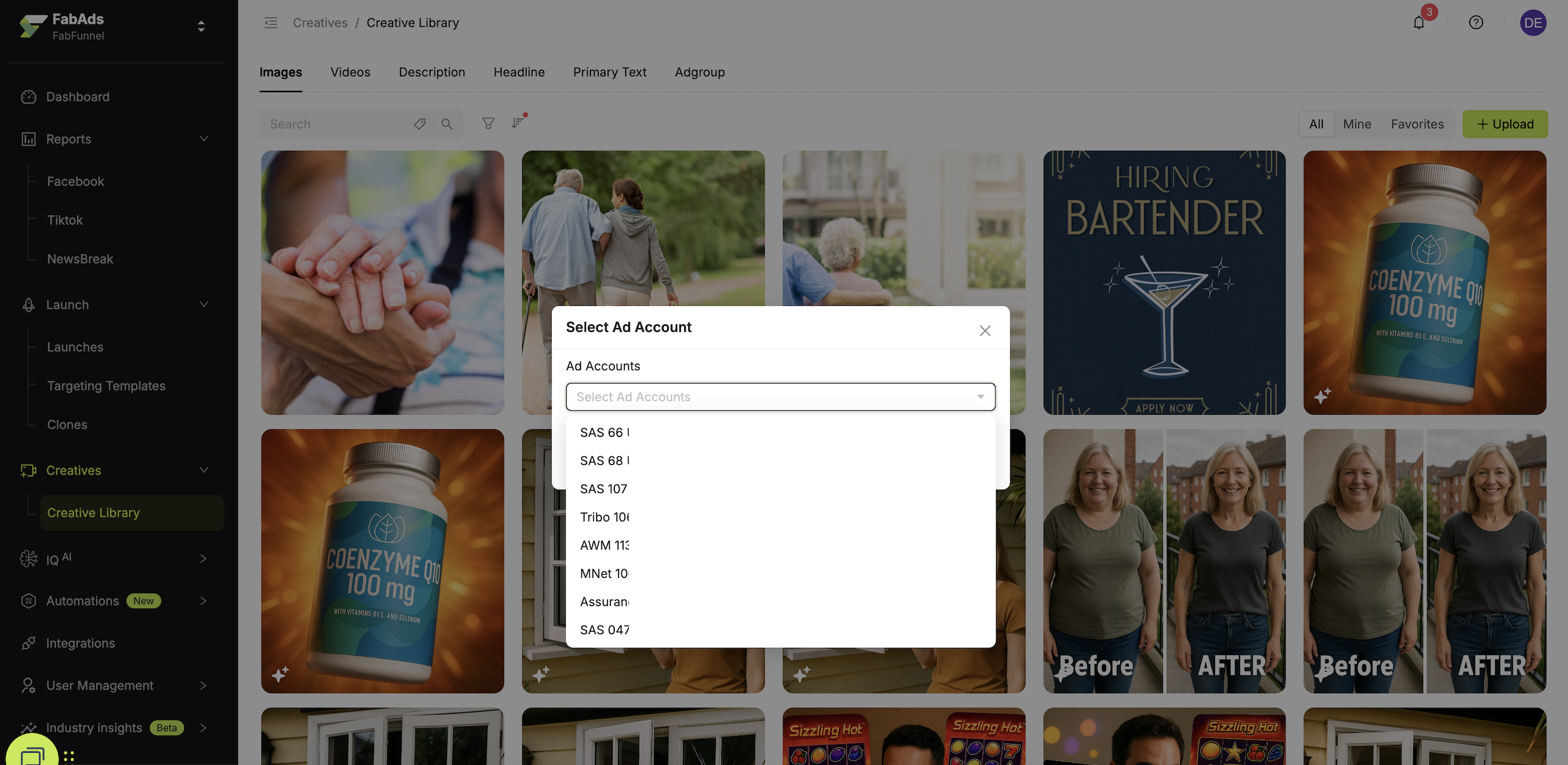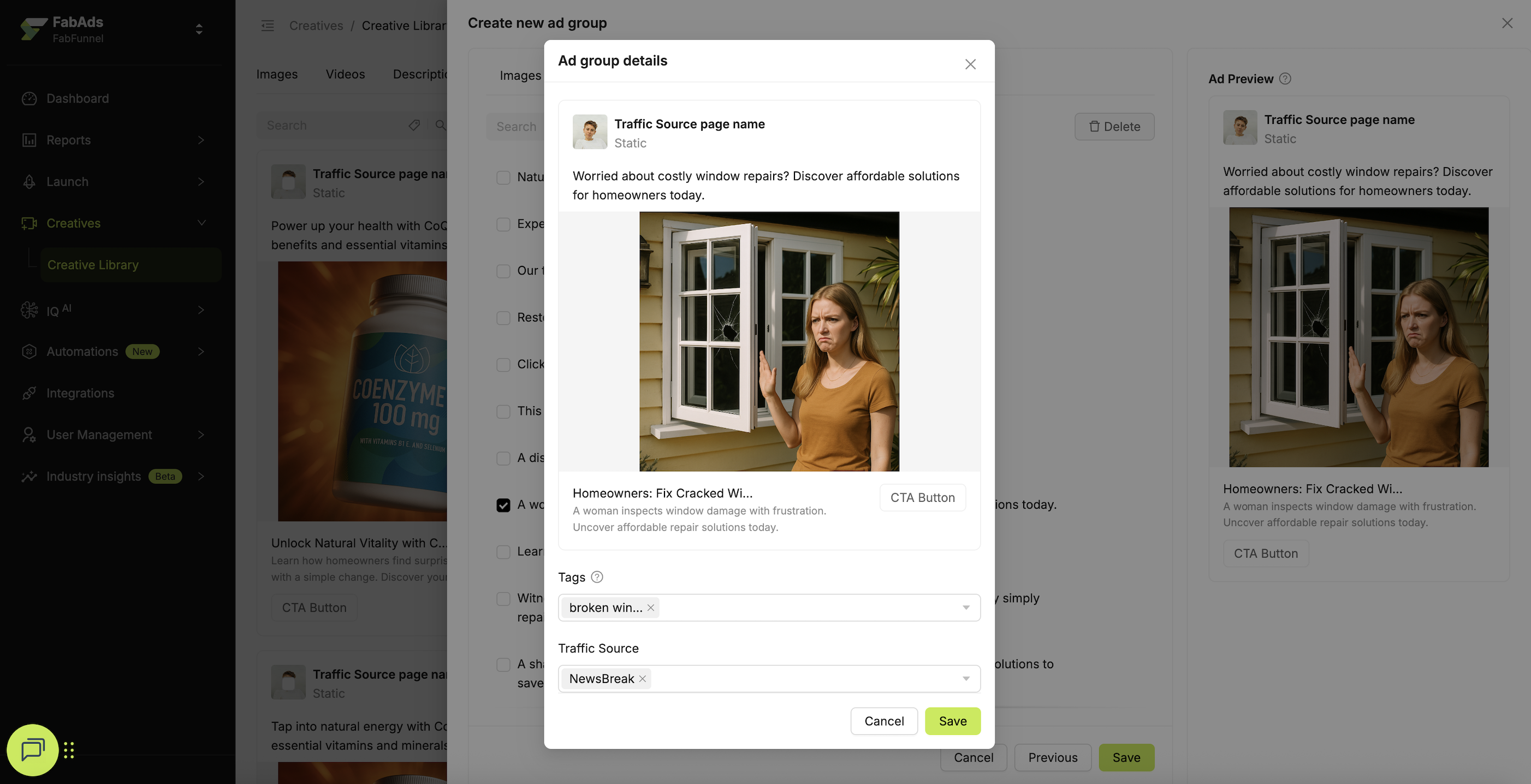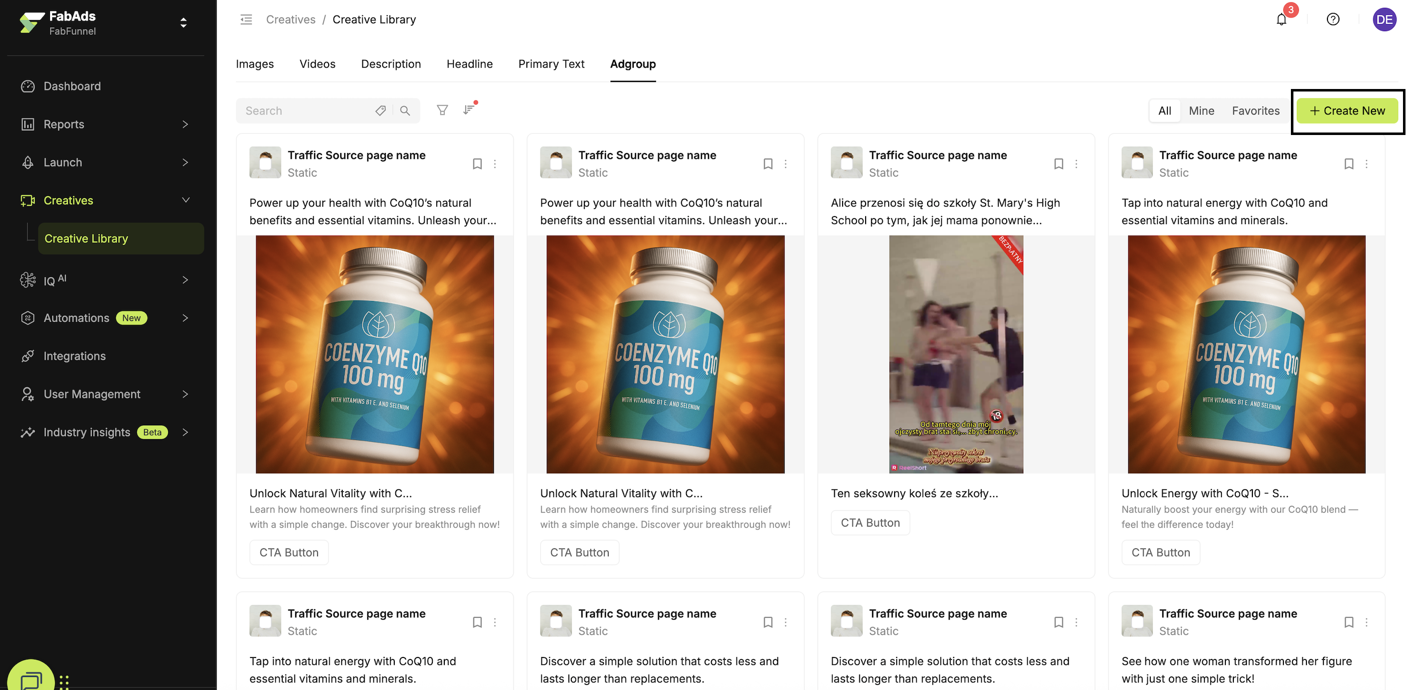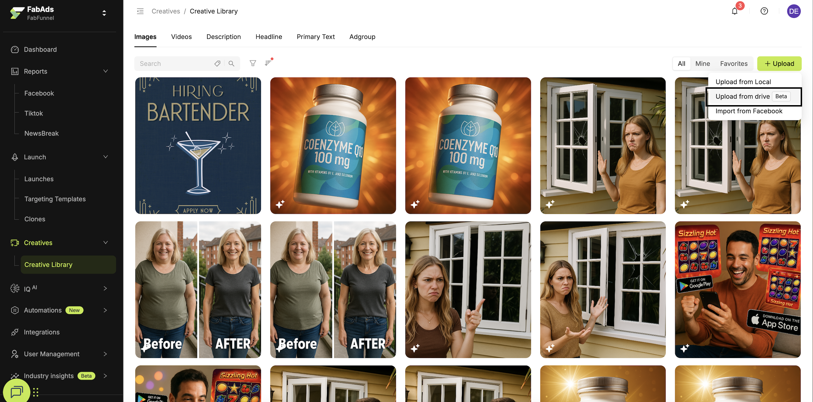 FabFunnel’s Creative Library centralizes management of images, videos, headlines, text, and adgroups. You can upload creatives from multiple sources, tag them for easy organization, and assemble complete adgroups.