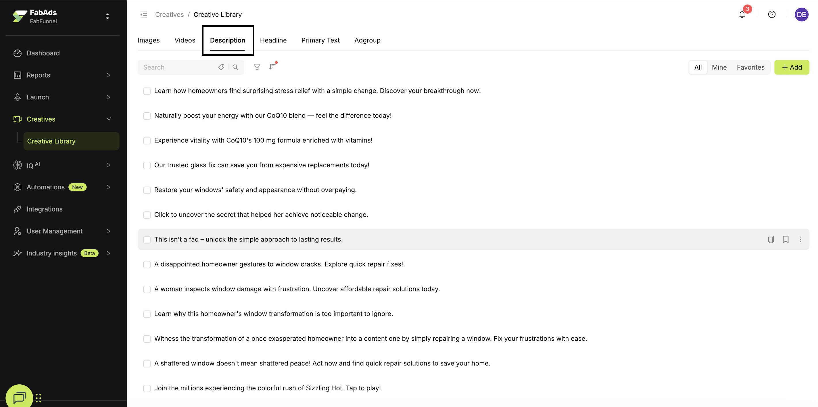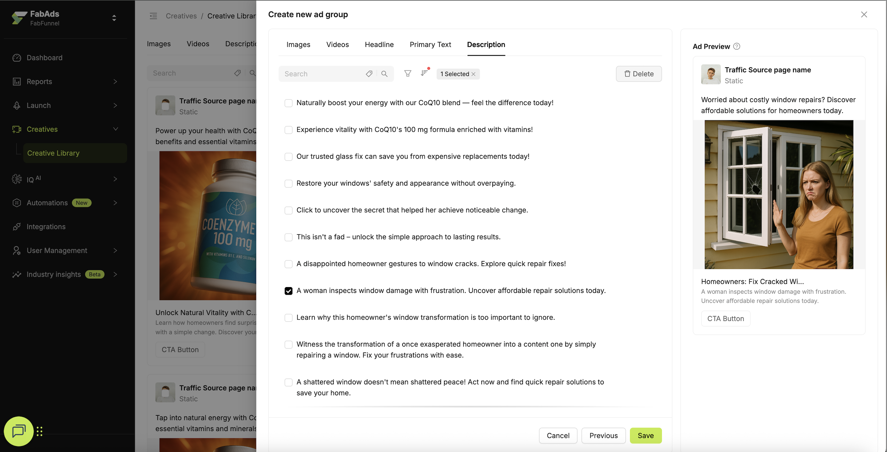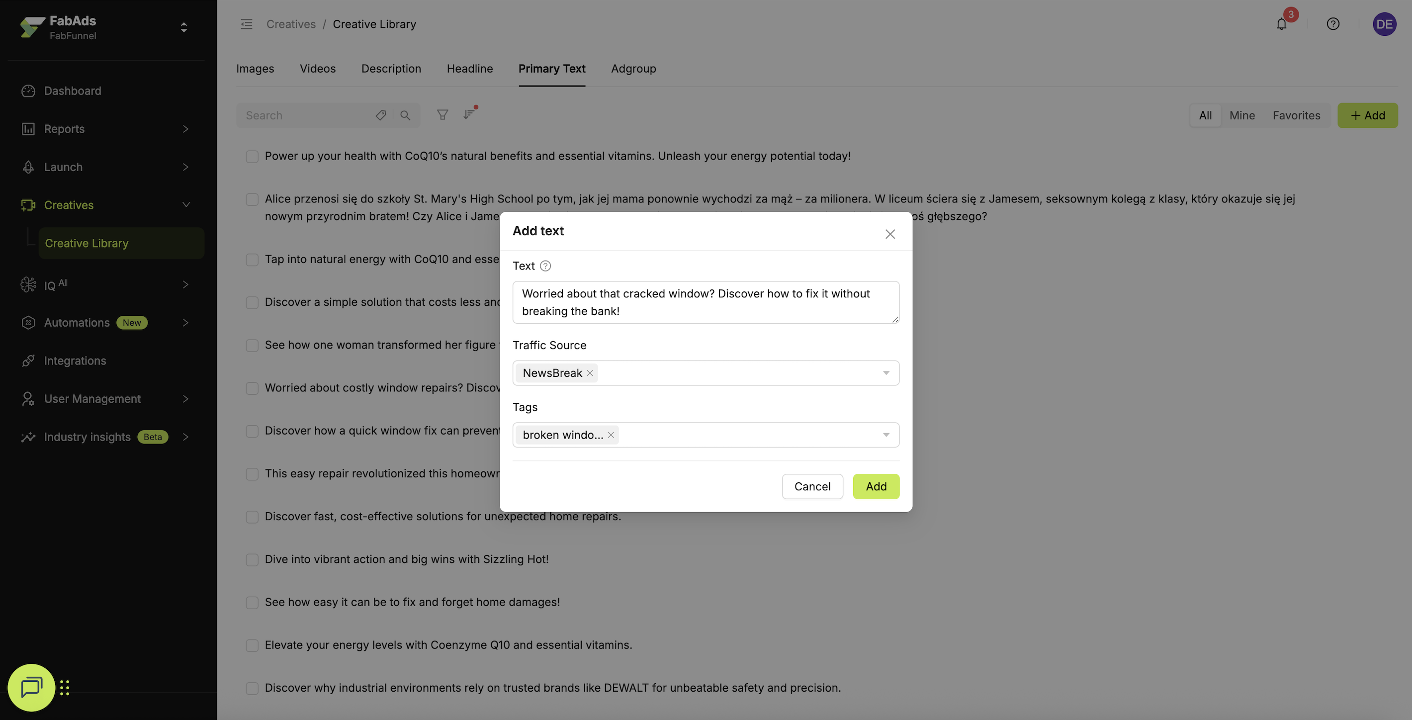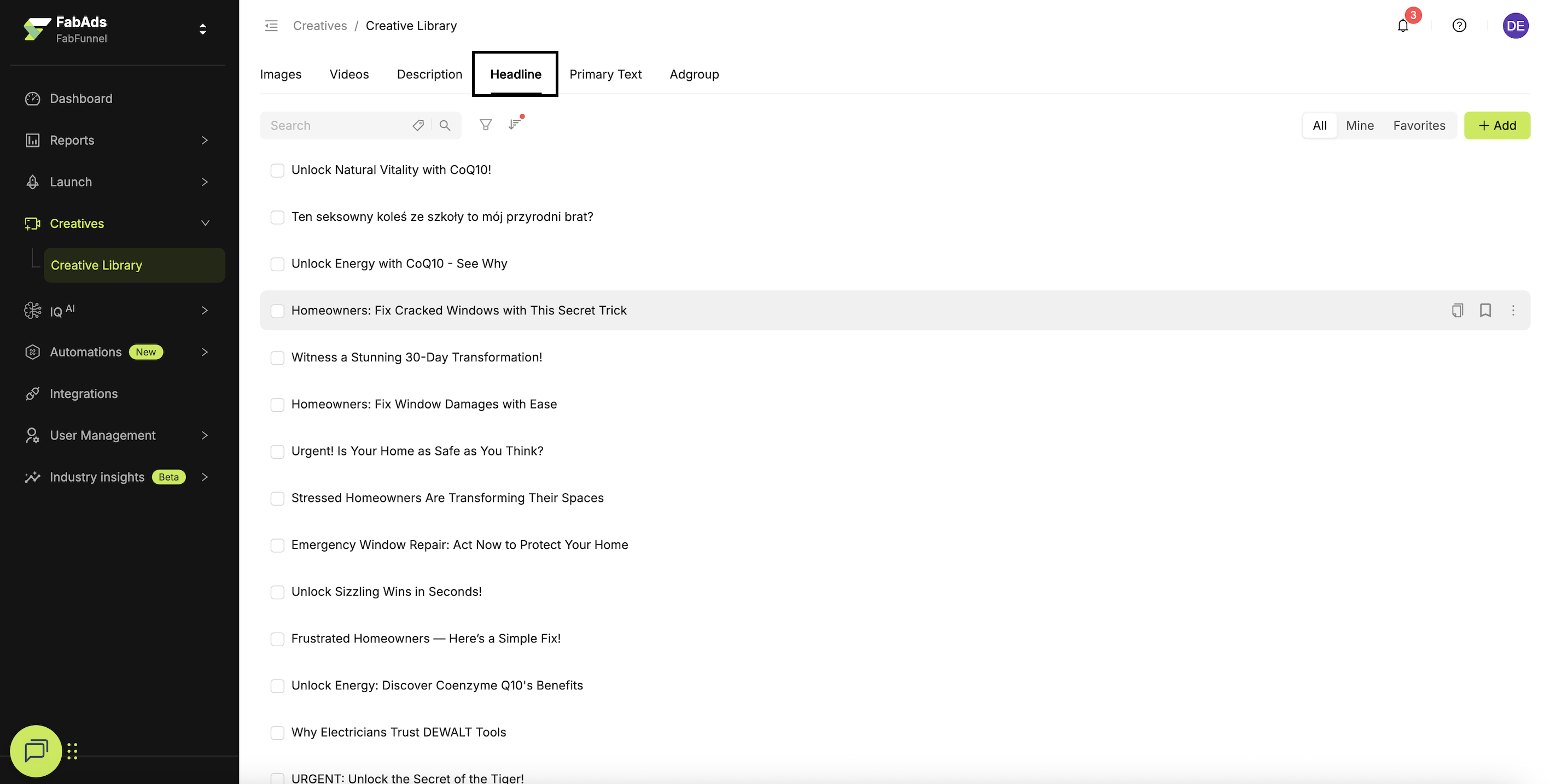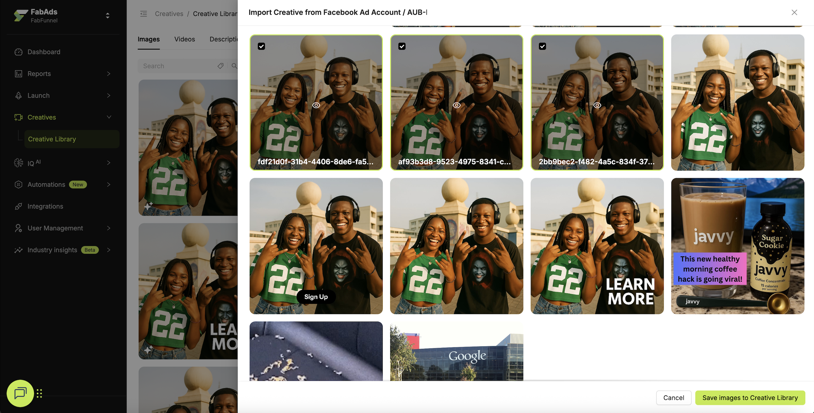 FabFunnel’s Creative Library centralizes management of images, videos, headlines, text, and adgroups. You can upload creatives from multiple sources, tag them for easy organization, and assemble complete adgroups.