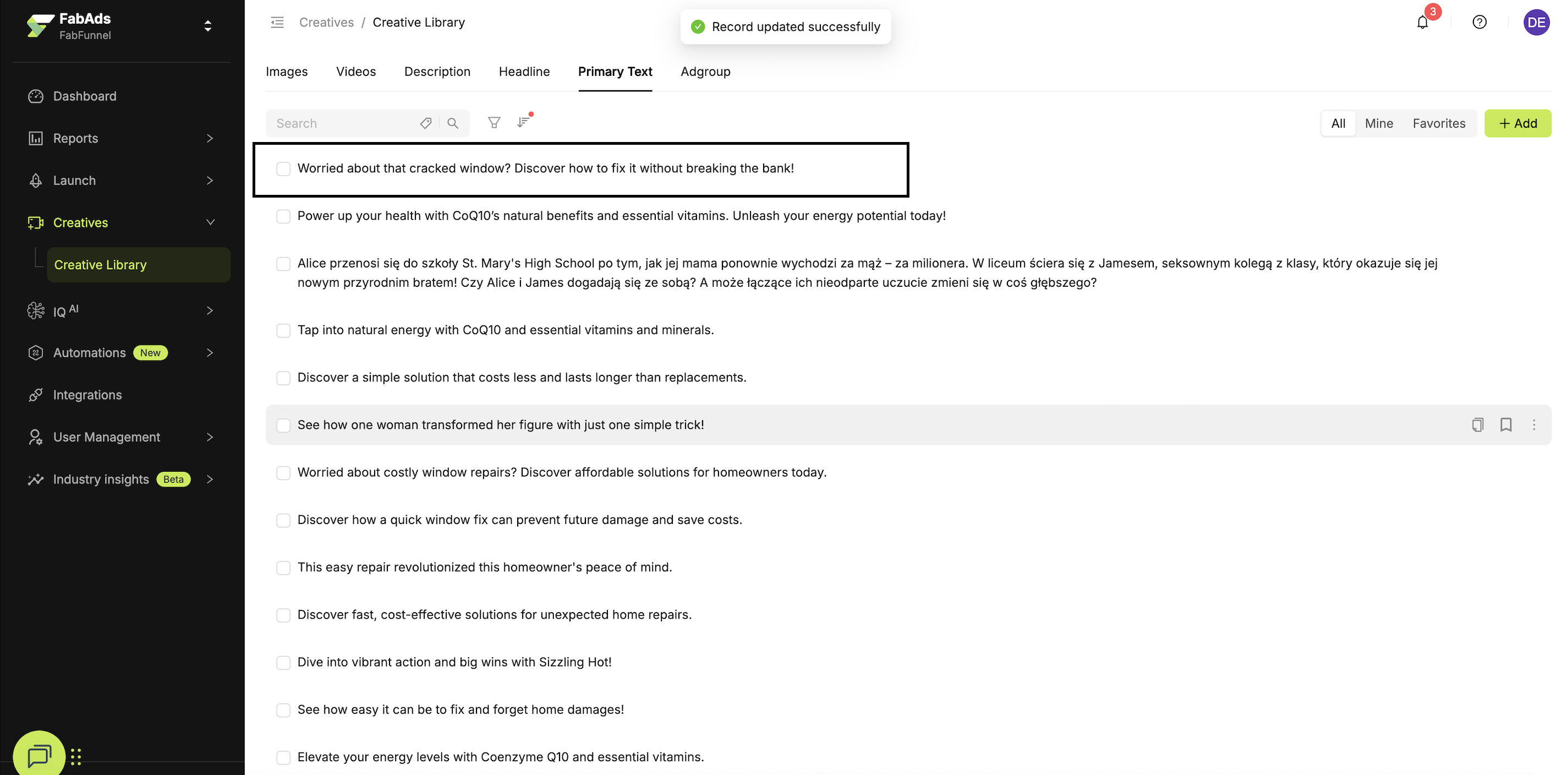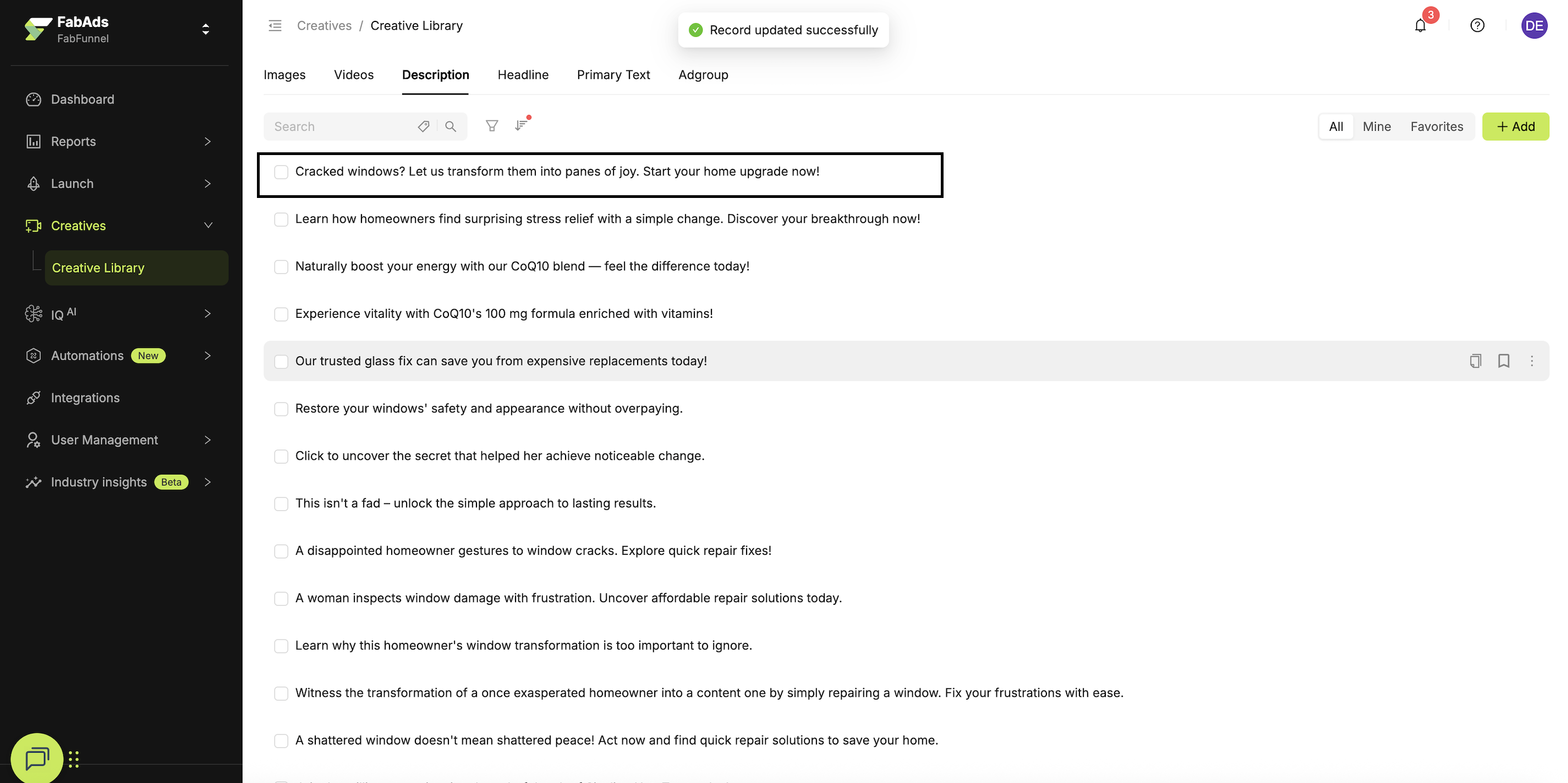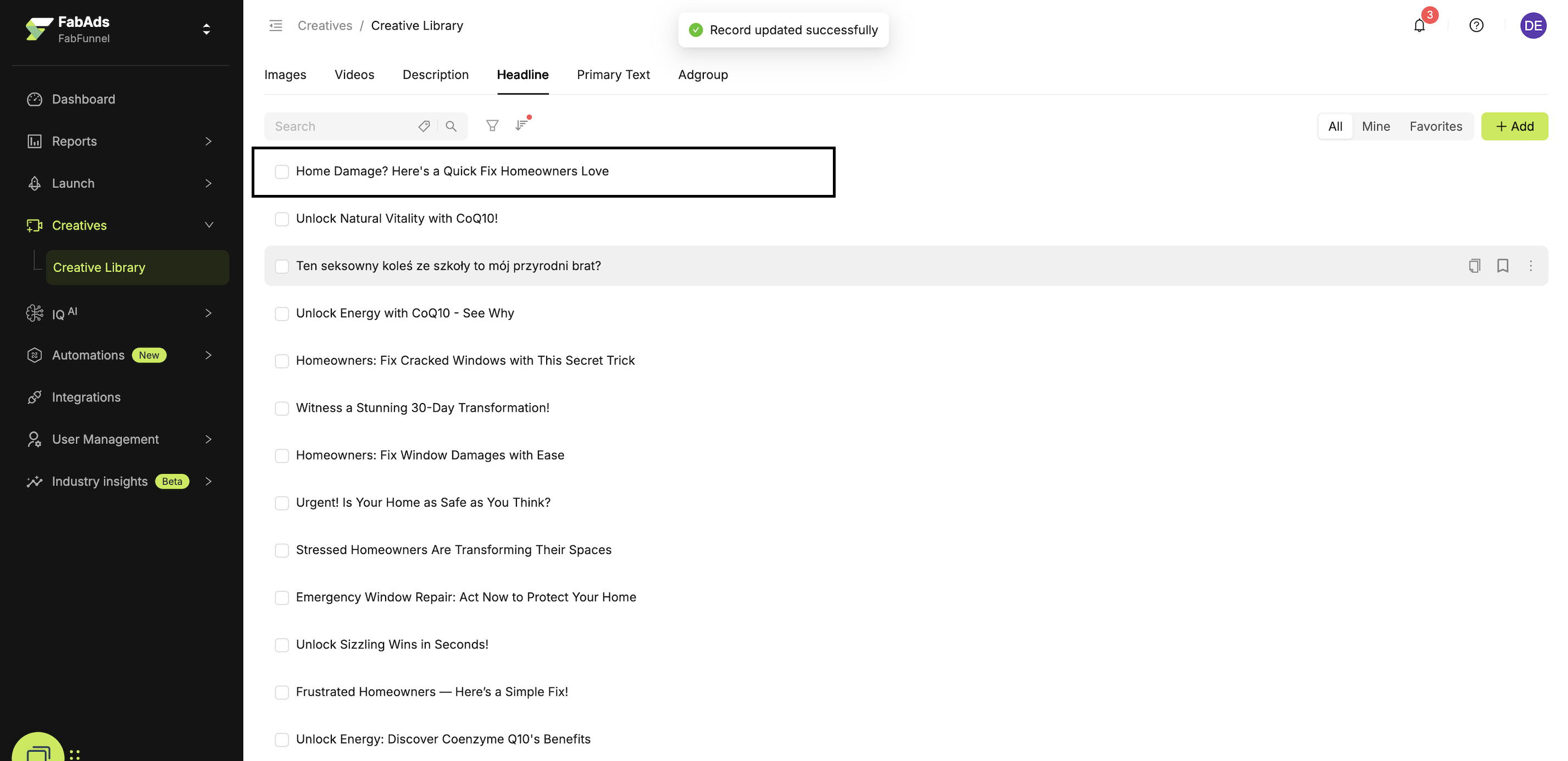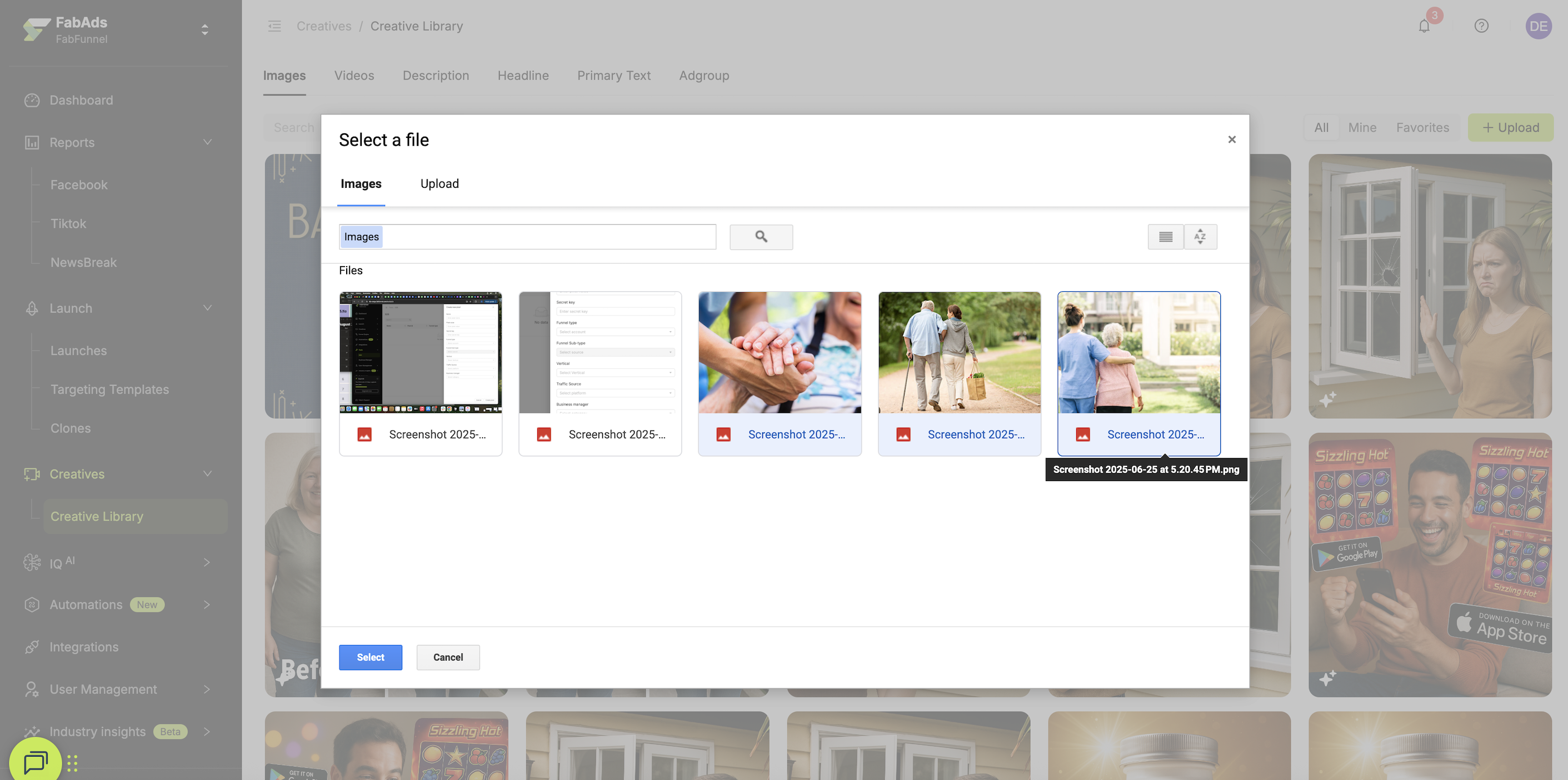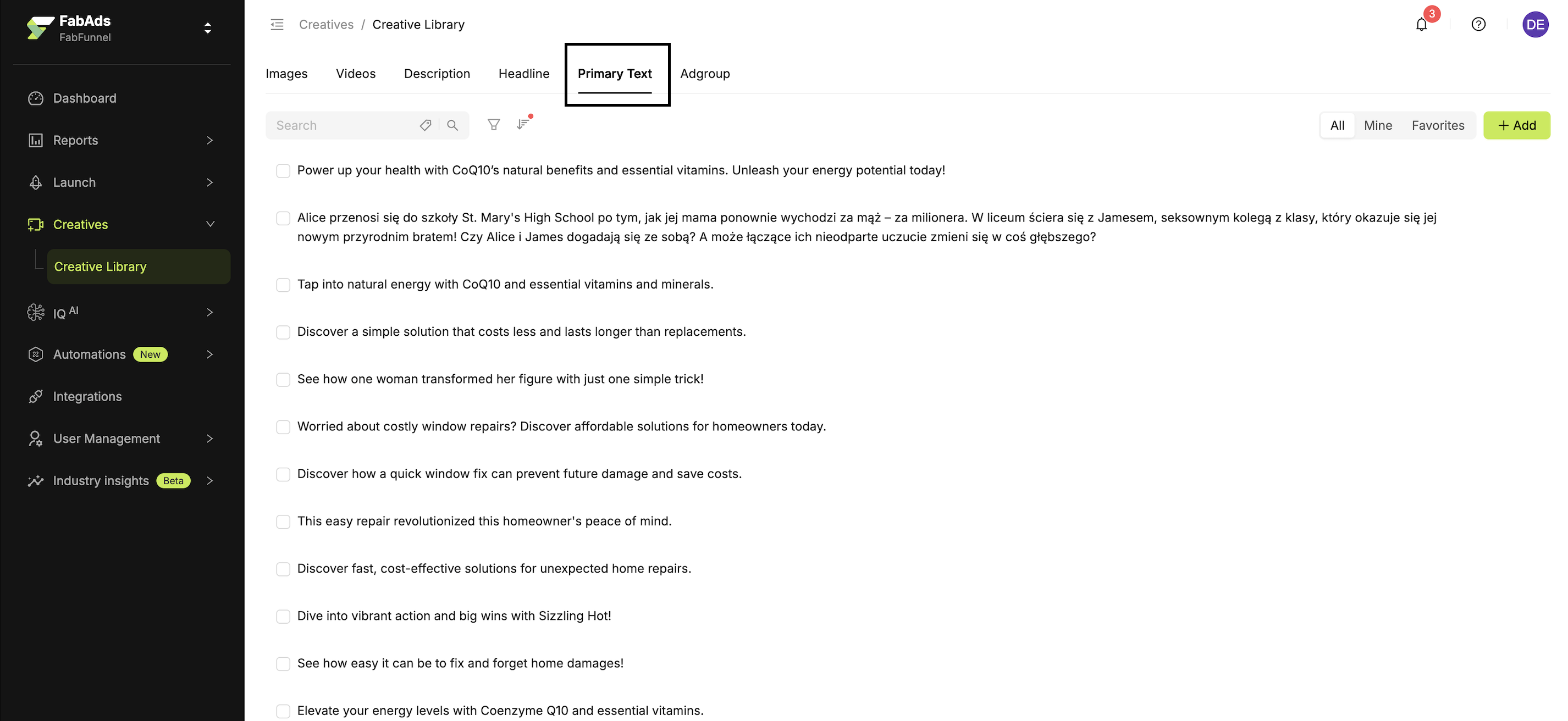 FabFunnel’s Creative Library centralizes management of images, videos, headlines, text, and adgroups. You can upload creatives from multiple sources, tag them for easy organization, and assemble complete adgroups.