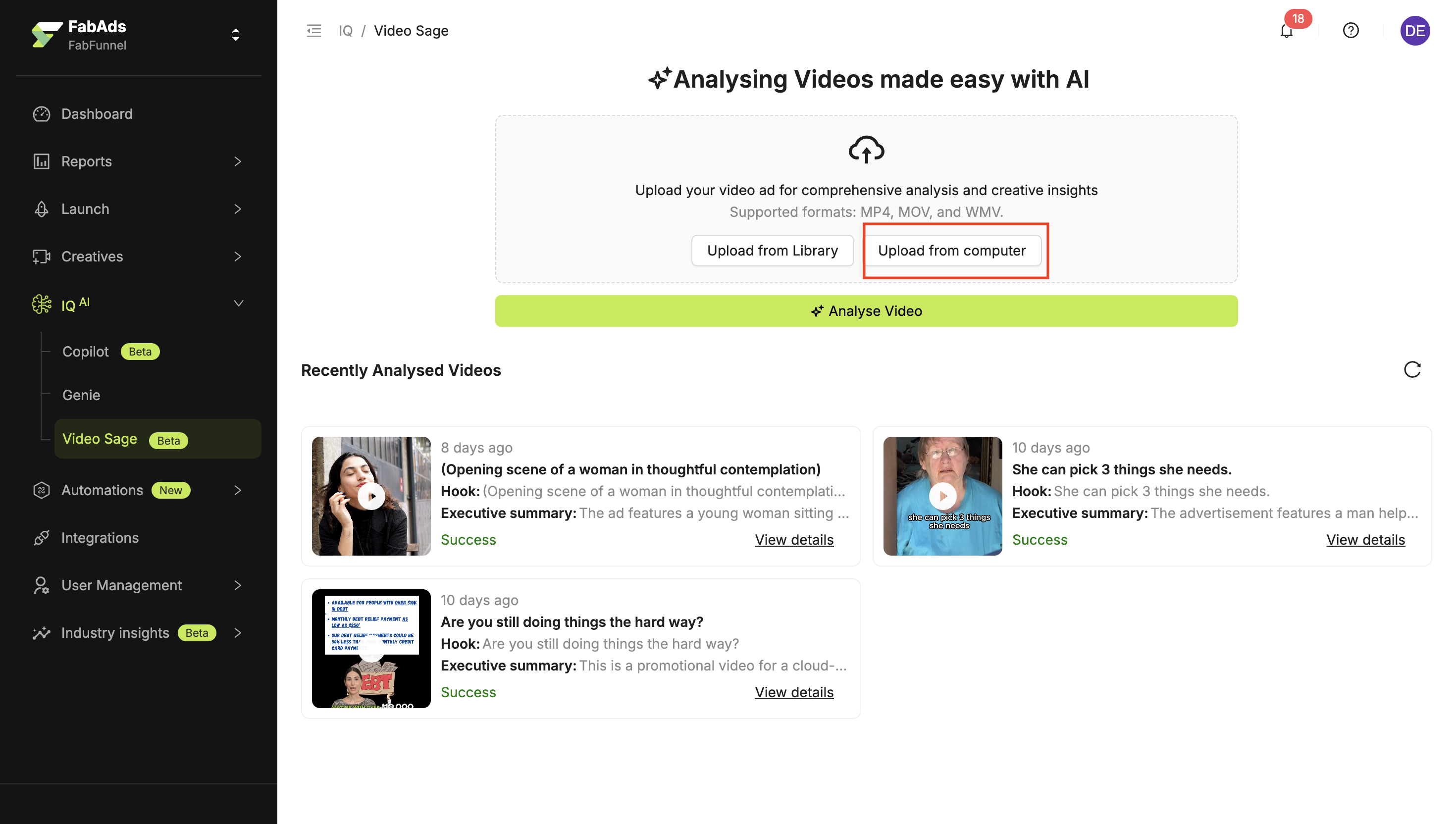 - To analyze a new video from your computer, click Upload from Computer, find your file, and Select.