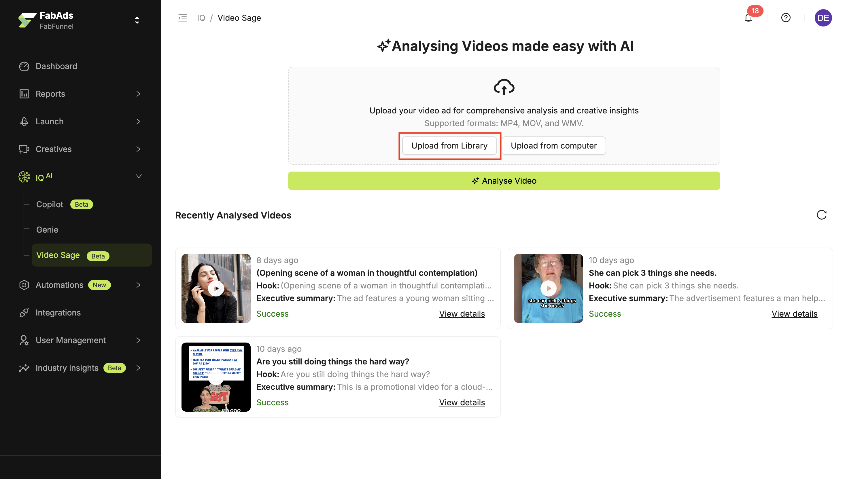 Video Sage is an AI-powered tool that performs deep, automated analysis of your videos to surface insights, hooks, interpretations, and effectiveness signals—helping you refine your creatives.